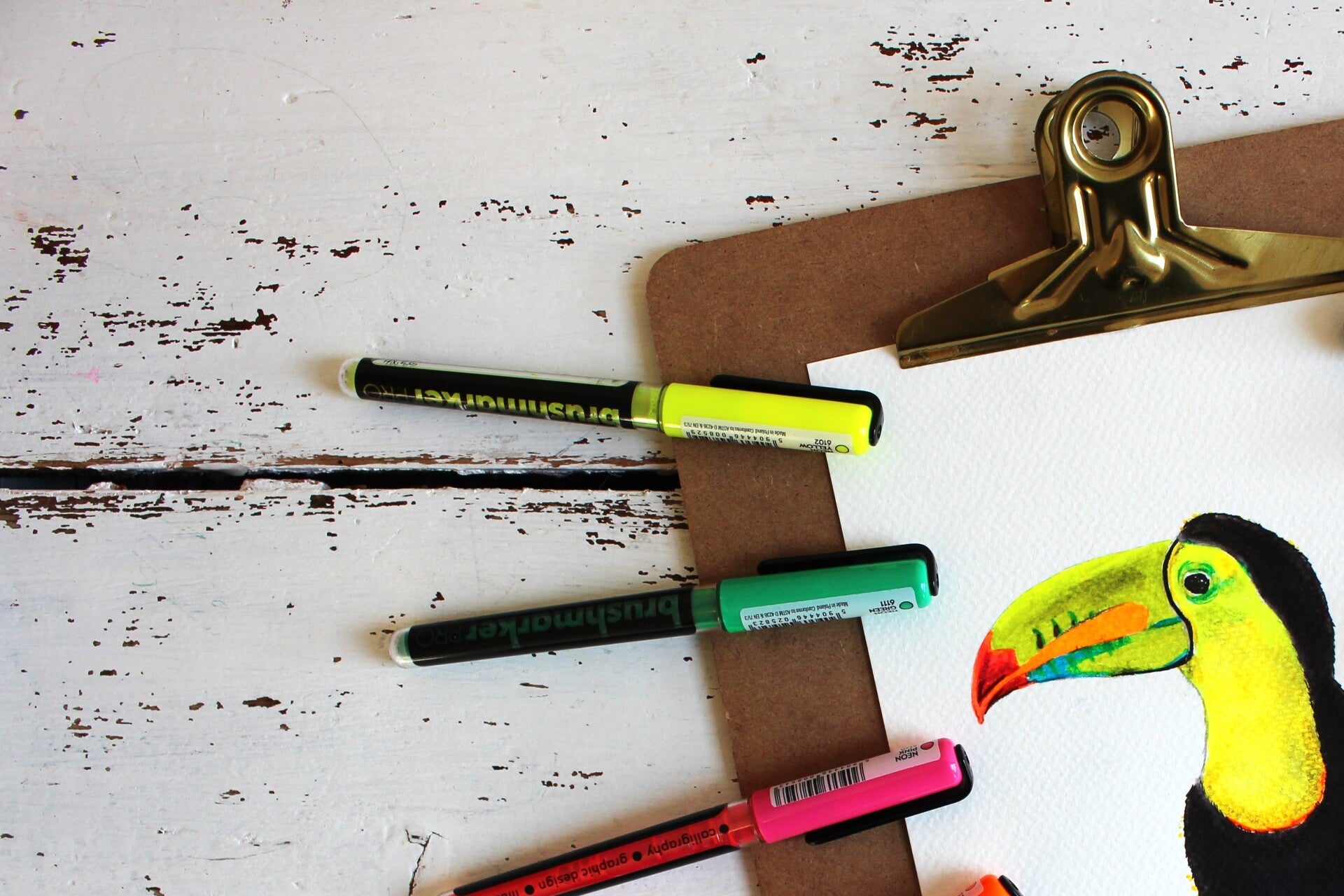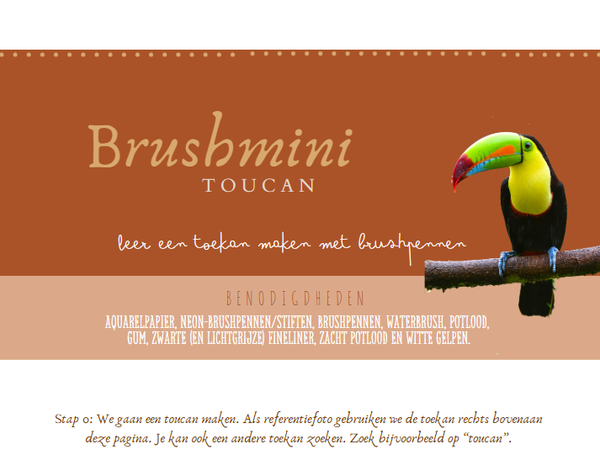 Een stappenplan om in zes stappen een toekan te maken met neon-brushpennen of neon-stiften. Brushjuf gebruikte Karin Brushmarker Pro Neon, maar het kan ook met andere neon- of fluorstiften.