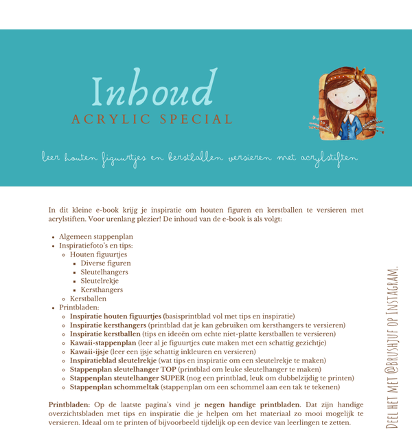 In deze special leer je kerstballen, kersthangers en houten figuurtjes versieren met acrylstiften (bv. van het merk Posca, Ohuhu of Karin Markers). Dit is een mini-e-book met 60 pagina's vol tips en inspiratie. De bundel bevat: