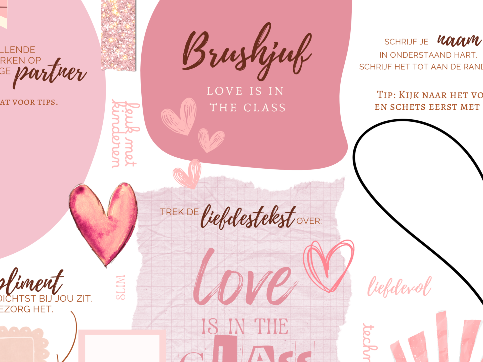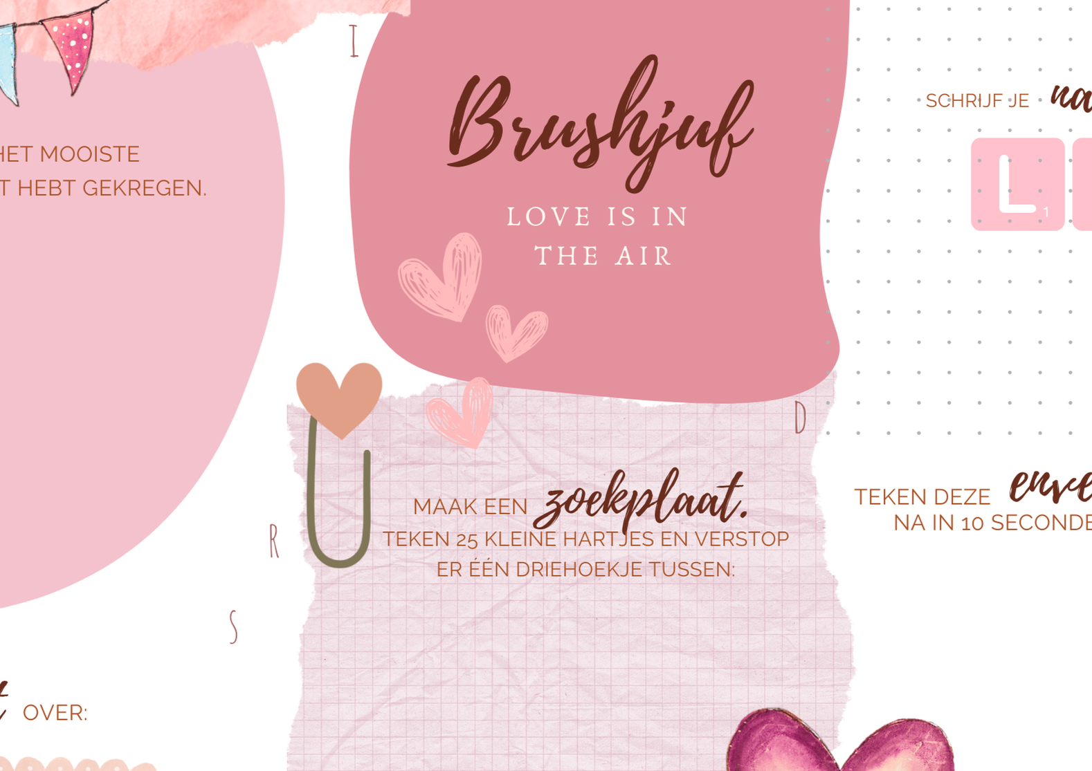 Valentijnsdag: Love is in the air! De set bevat twee placemats met als thema "liefde". Perfect voor Valentijnsdag. Met leuke gespreksvragen. Denk na over je ideale toekomstige partner, waardevolle complimenten en meer moois! Tegelijk oefen je het handschrift en handletteren. Hoewel er op eentje "love is in the class" staat, kan je er zeker thuis ook veel plezier aan de beleven.