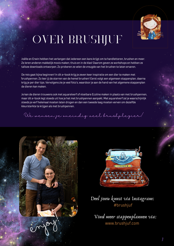 Digilessen: Voor wie het maximale uit het galaxy's brushen wil halen, ontwikkelde Brushjuf Digilessen. Je krijgt dan toegang tot een online-omgeving met ruim dertig uitgewerkte ideeën met video's. Elke tussenstap heeft een eigen video. Elke les staat in een overzichtelijke presentatie. Ideaal om kunst zoals in dit e-book staat aan te leren. Ook perfect voor kids om zelfstandig door te werken én als digibordles voor op school.