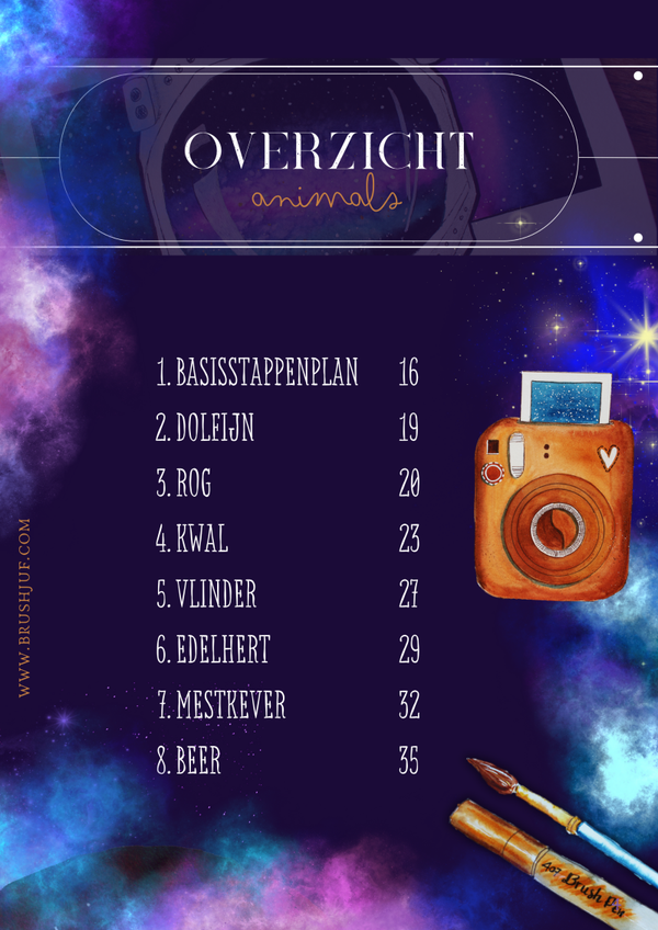 Inhoud: Na een introductie van dertien pagina's vol handige technieken en tips ben jij klaar om aan de slag te gaan. In dit e-book krijg je zeven keer inspiratie om een dier te maken met brushpennen. Zo leer jij de sterren van de hemel brushen! Eerst volgt een algemeen stappenplan, daarna krijg je per dier tips. Vervolgens zie je veel foto’s, waardoor je aan de hand van het algemene stappenplan de dieren kan maken. Dit e-book bevat 38 pagina's vol inspiratie!